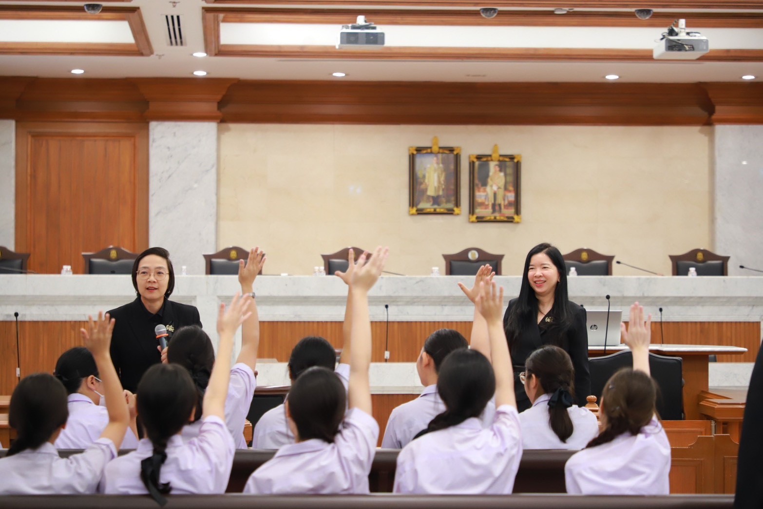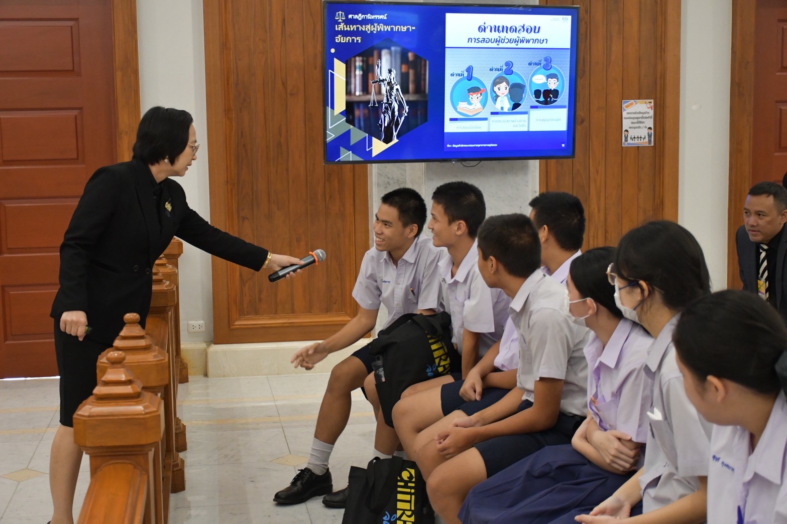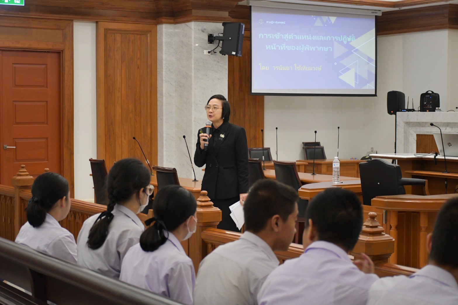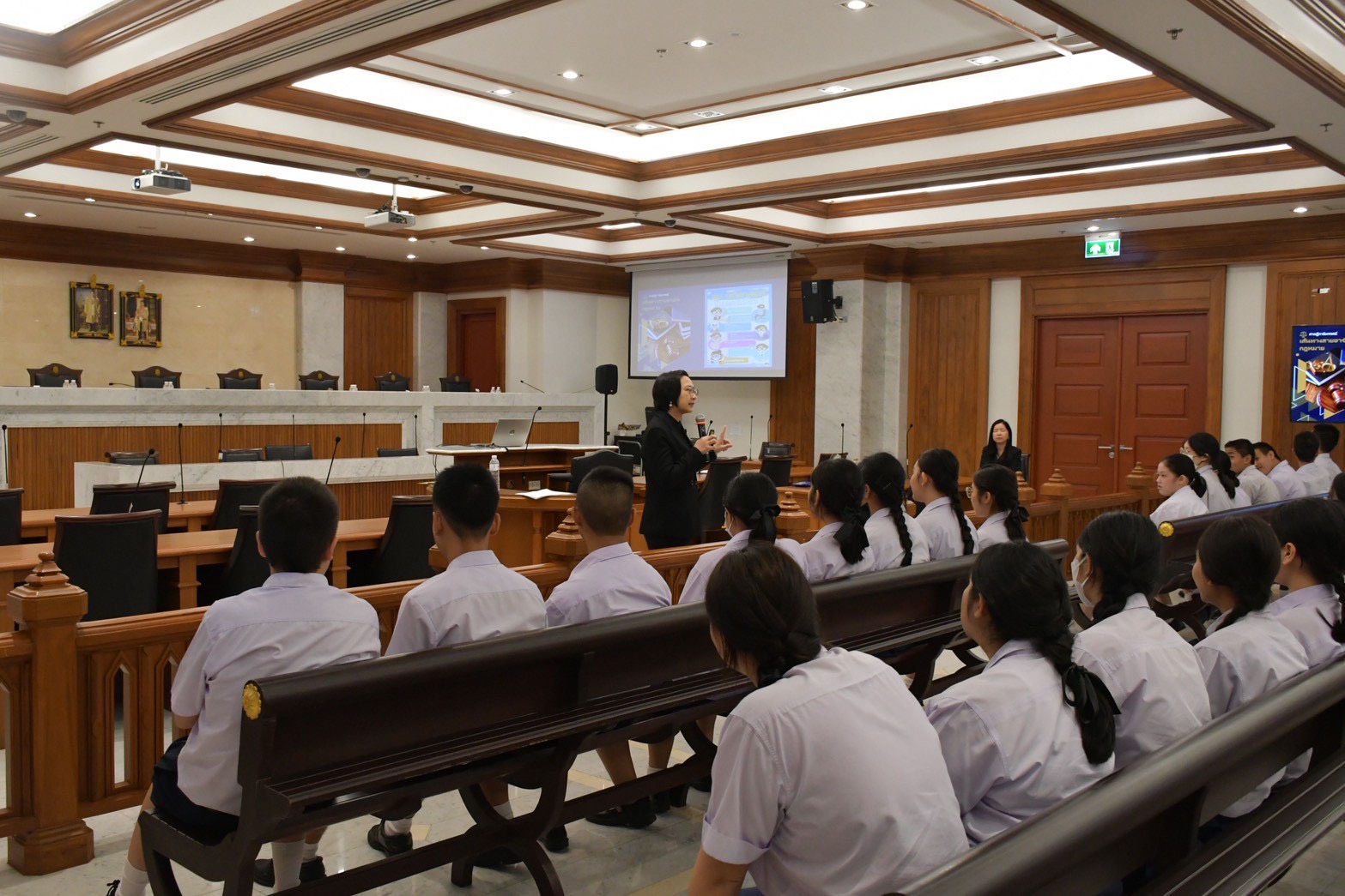 นอกจากนี้ นักเรียนยังได้เข้าเยี่ยมชมห้องพระรูปหุ่นพระเจ้าบรมวงศ์เธอ พระองค์เจ้ารพีพัฒนศักดิ์ กรมหลวงราชบุรีดิเรกฤทธิ์ และรับฟังการบรรยายพิเศษในหัวข้อ “การเข้าสู่ตำแหน่งและการปฏิบัติหน้าที่ของผู้พิพากษา” โดยคุณวรนันยา ใช้เทียมวงษ์ ผู้พิพากษาหัวหน้าศาลประจำกองผู้ช่วยผู้พิพากษาศาลฎีกา รวมถึงการเยี่ยมชมยอดปราสาทยุติธรรม ศาลฎีกานิทรรศน์ และเยี่ยมชมทัศนียภาพสวนกลางอาคารศาลฎีกา